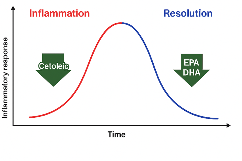 The studies used cell culture and “skin in a lab” 2D and 3D skin models to demonstrate that broadly speaking cetoleic acidacts on the initial phase of inflammation, and that EPA and DHA promote the end phase, known as inflammation-resolution via potent omega-3 products made at the site of inflammation.